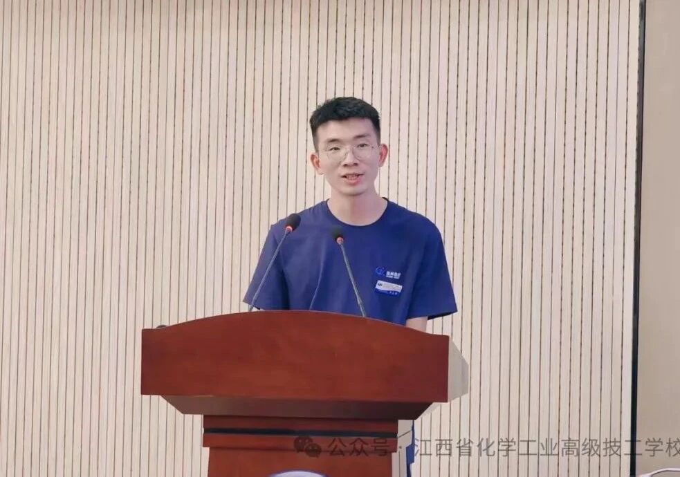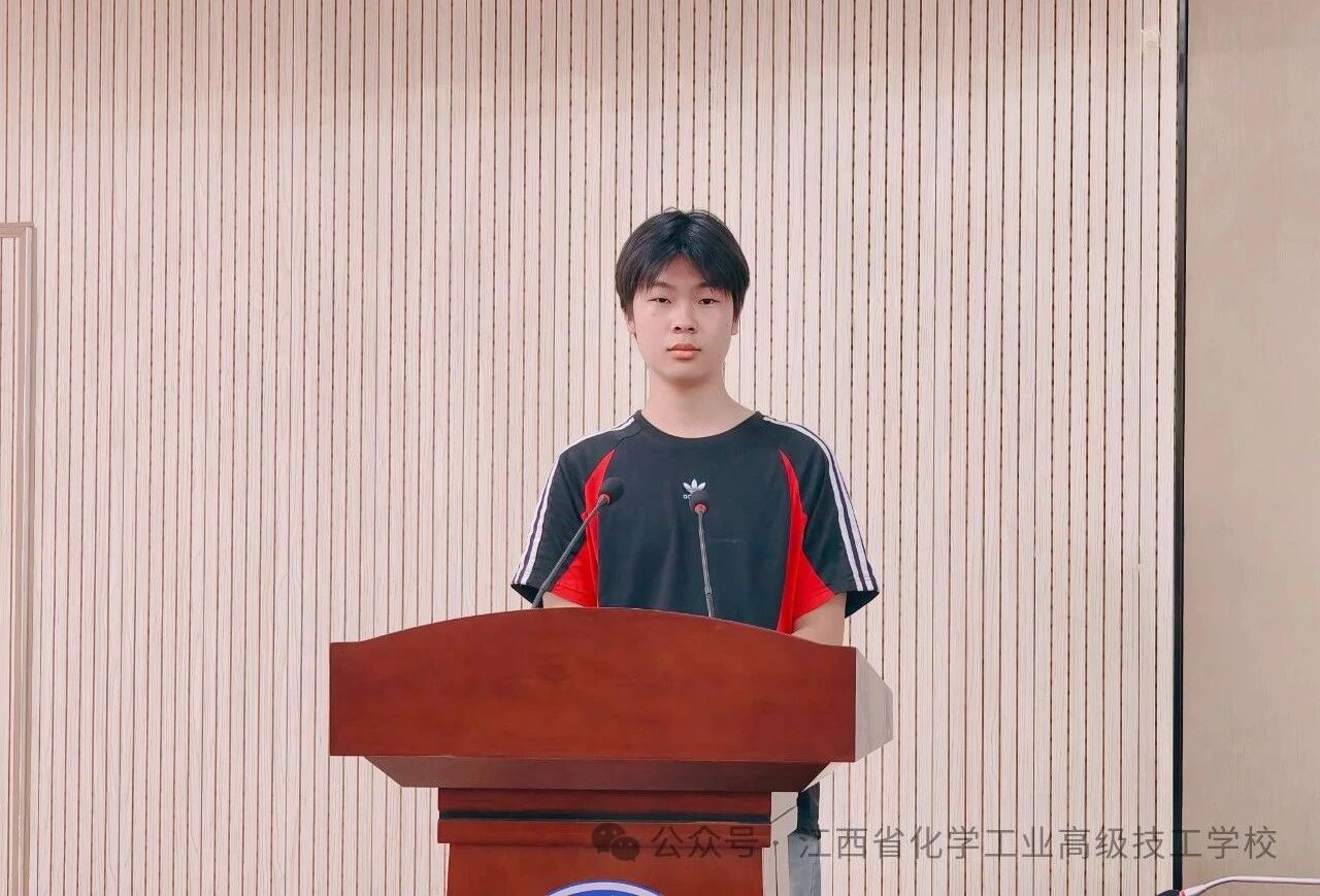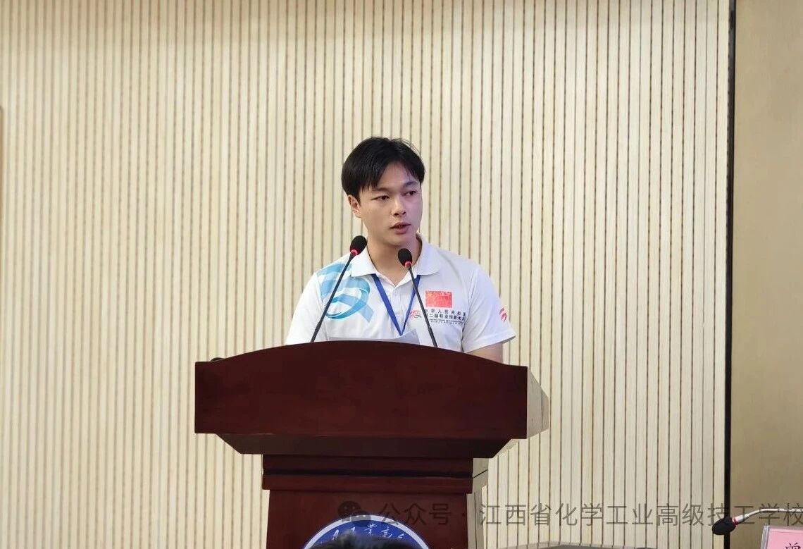 化学实验室技术赛项铜牌获得者2022级化工工艺班朱军同学作为获奖学生代表发言。朱军同学对支持、鼓励和帮助自己一路成长的老师以及同学表示感谢,并分享了自己参加比赛的心路历程和成长收获。