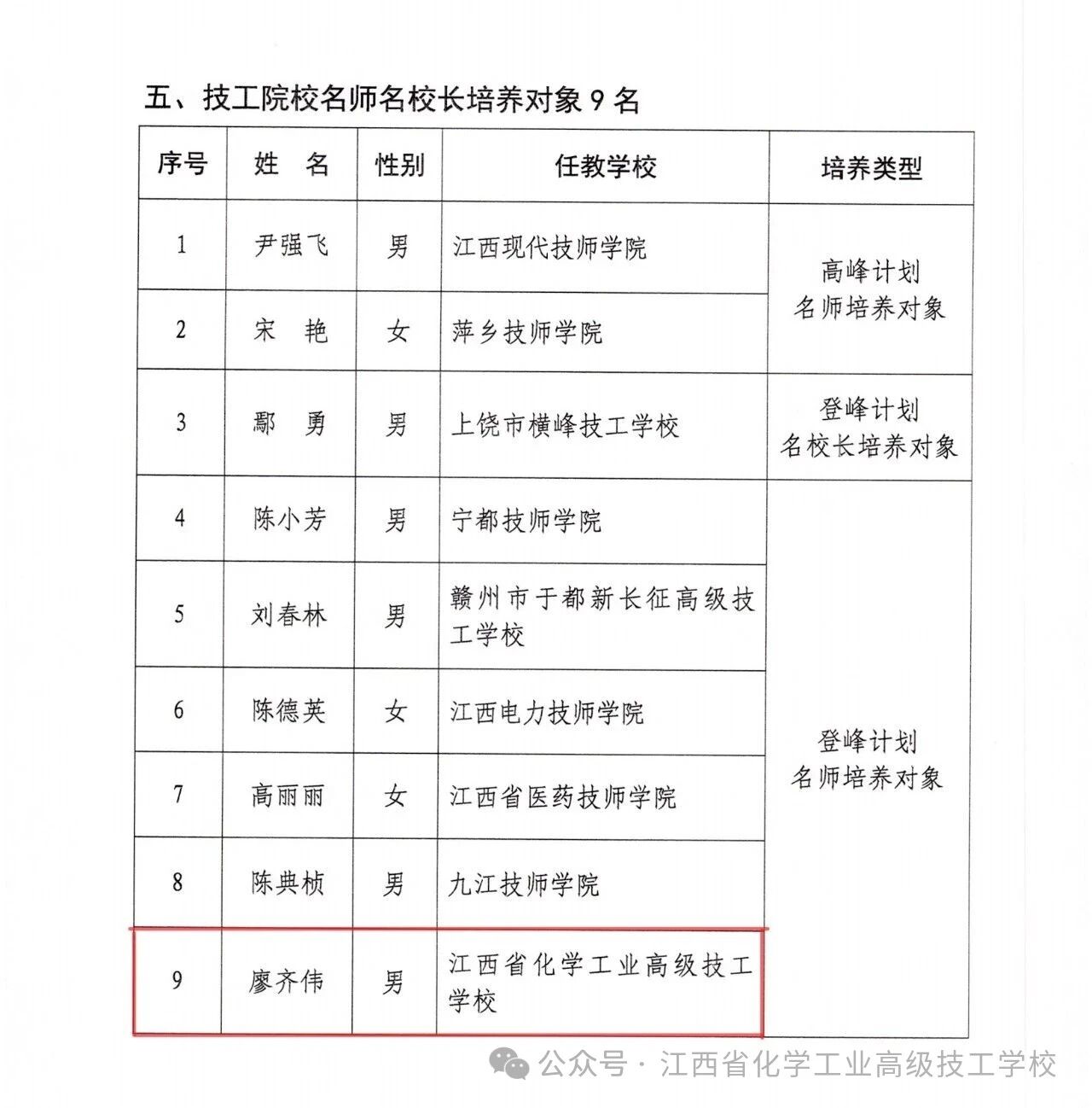 在我省大力推进高技能人才队伍建设的浪潮中,我校师资建设再传捷报!智造信息部廖齐伟老师入选江西省“赣鄱名师名校长启航工程”培养计划,荣膺技工院校“登峰计划名师”称号。这是我校教师第二次荣获此殊荣。他们以匠心育人,以实力登峰,为学校高质量发展再添华章。