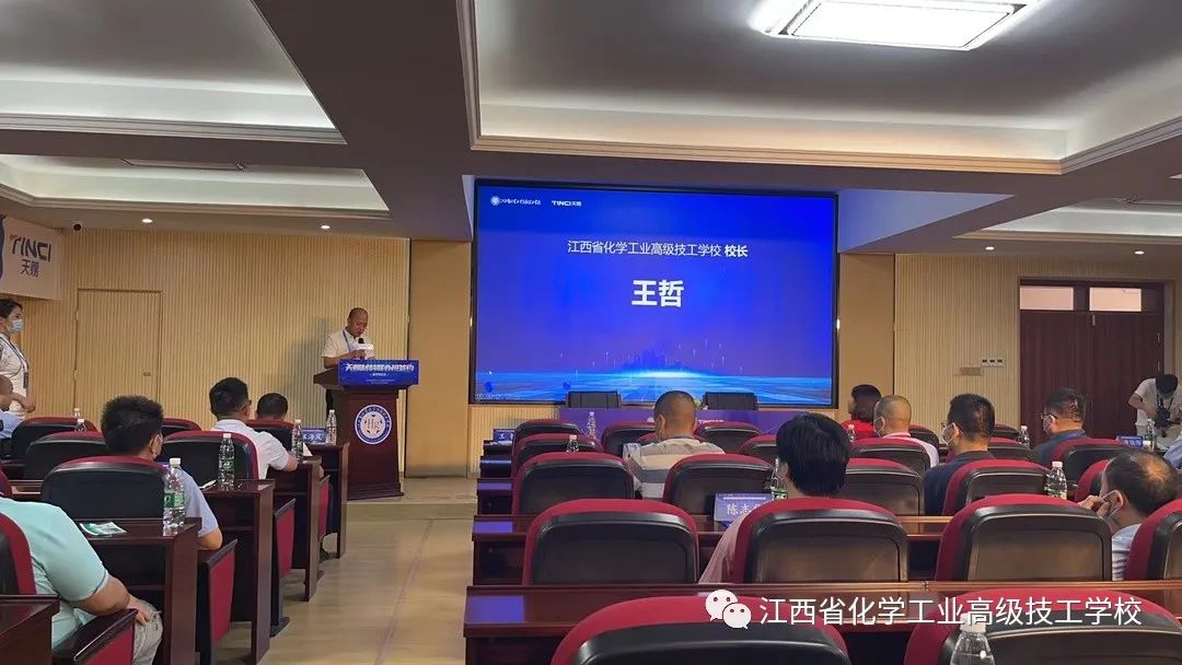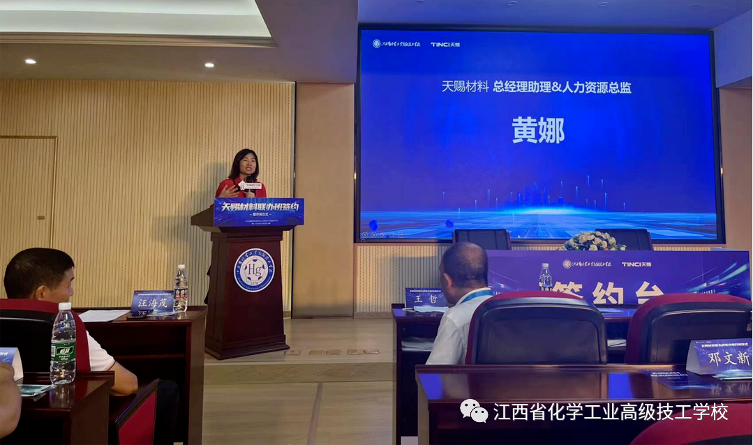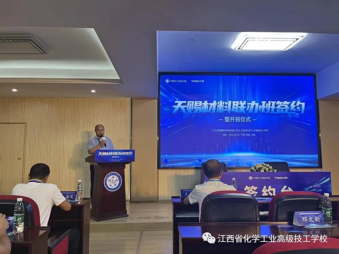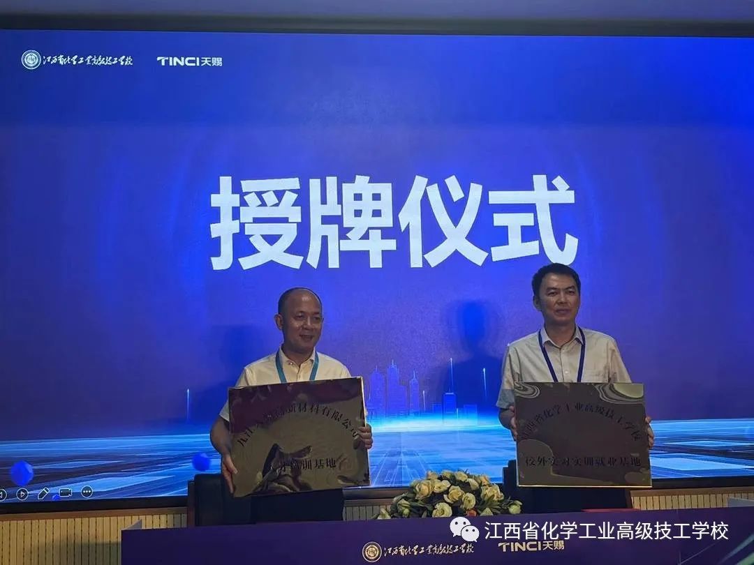 随后,九江天赐高新材料有限公司总经理黄晓伟和江西省化学工业高级技工学校进行了校企签约仪式并授牌。
