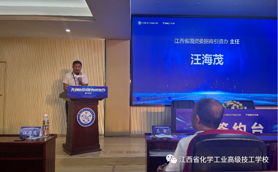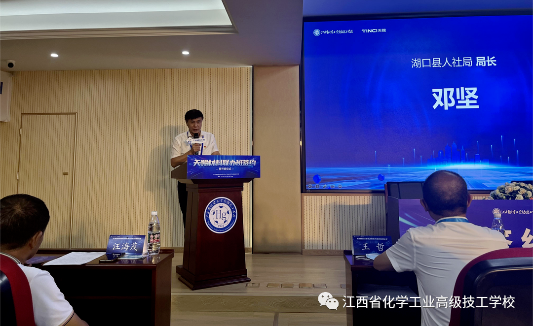 天赐材料总经理助理黄娜在致辞中详细地介绍了企业的发展历程,企业规模以及表达了天赐集团对天赐校企合作班的重视。湖口县人社局局长邓坚从两个方面肯定了校企合作在当地经济建设中的重要性。省国资委招商引资办主任汪海茂则着重阐述了产教融合在江西“2+6+N”产业高质量跨越式发展中的重要作用,并对化工高技与天赐材料的合作给予了厚望。